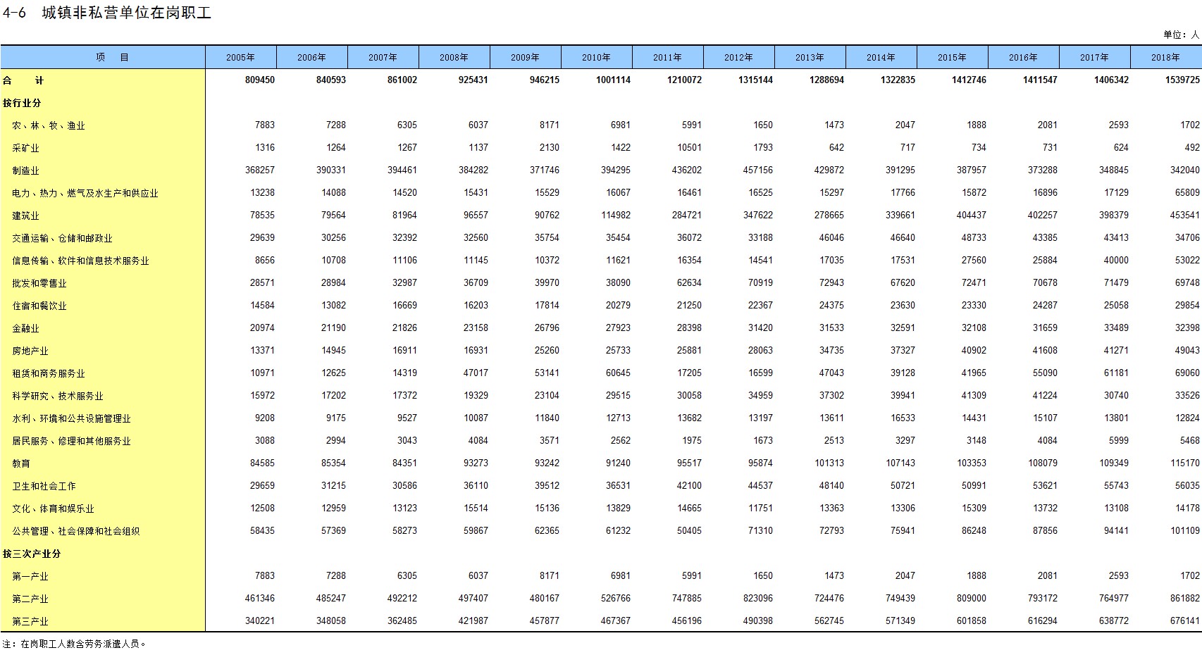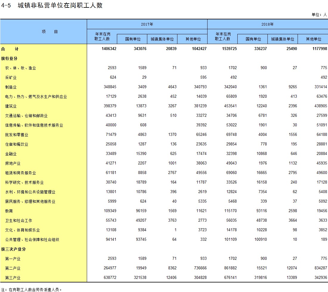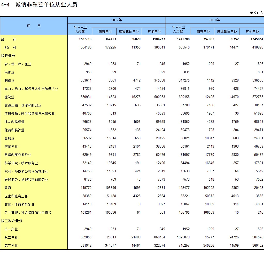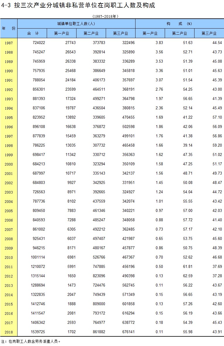 4-3 按三次产业分城镇非私营单位在岗职工人数及构成