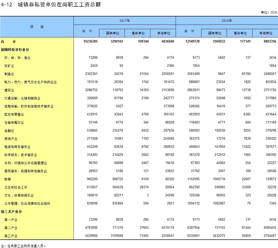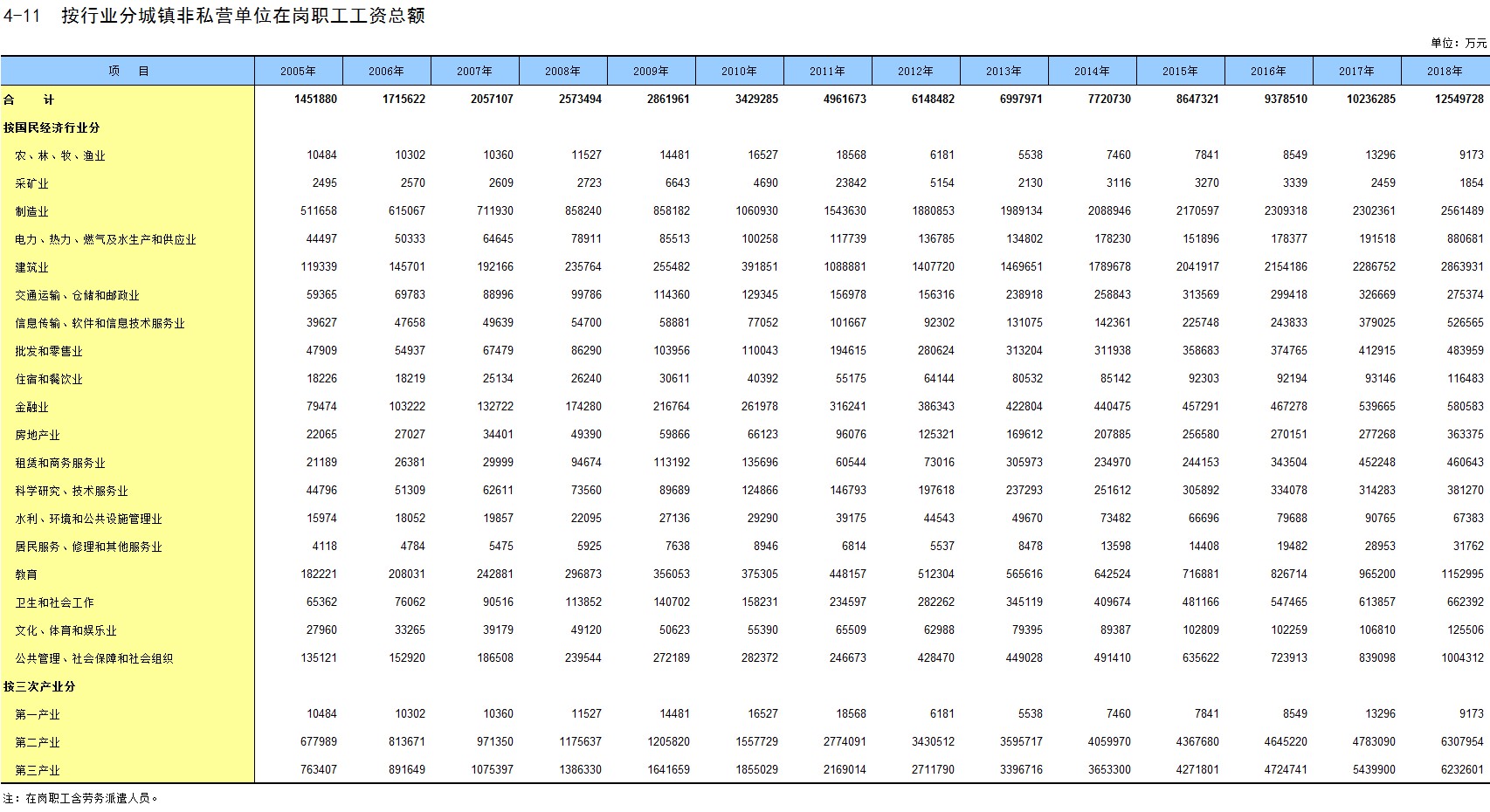 4-11 按行业分城镇非私营单位在岗职工工资总额