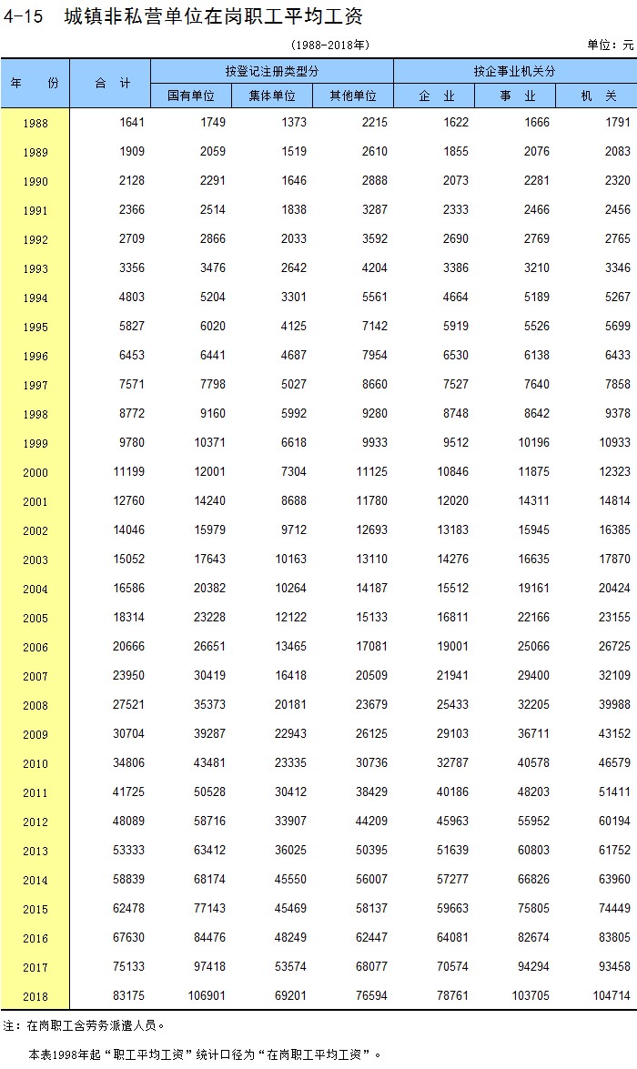 4-14 按行业分城镇非私营单位在岗职工平均工资