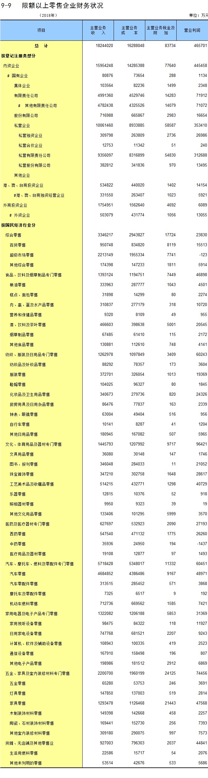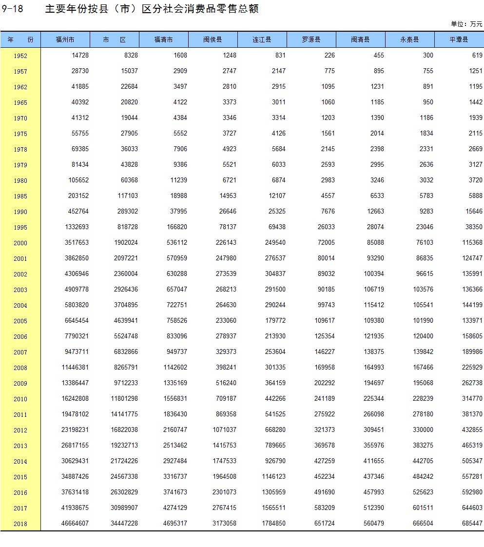 9-18 主要年份按县(市)区分社会消费品零售总额