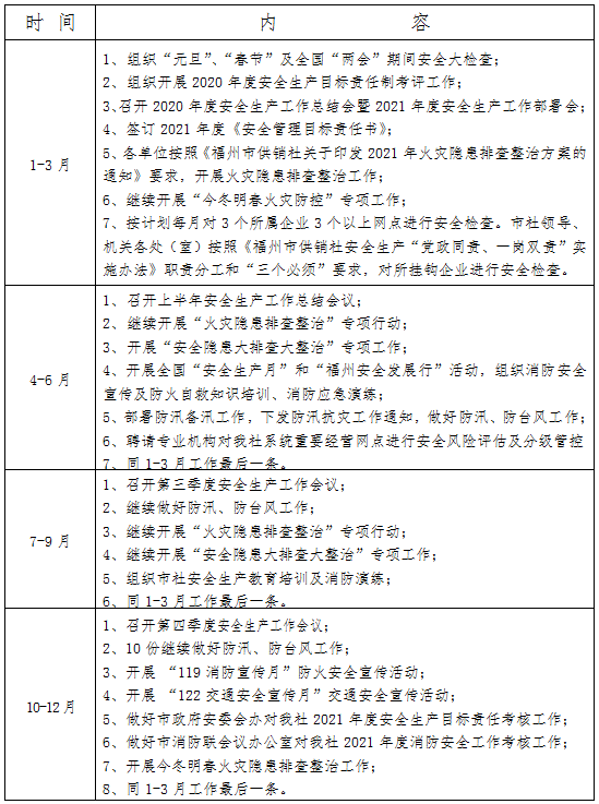 (四)继续做好安全生产专项整治三年行动工作。按照《市供销社系统安全生产专项整治三年行动实施方案》(榕供安〔2020〕177号)文件要求,继续落实企业安全生产主体责任,推进危险化学品、烟花爆竹、消防安全、房屋结构安全隐患大排查大整治等重点工作,按照时间节点完成“动员部署、排查整治、集中攻坚、巩固提升”四个阶段工作。