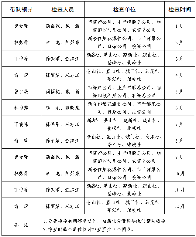 2023年对直属单位的安全生产监管工作,依据“党政同责、一岗双责、齐抓共管、失职追责”和“三个必须”的要求,由分管挂钩联系单位的领导负责监管。安全检查由市社分管挂钩联系单位的领导带队,每月安排检查3个基层单位,每个单位至少抽查3个网点(见附表,检查单位可根据实际情况适时调整)。