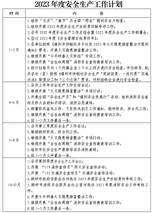 为全面贯彻落实市委百家乐赌场关于做好安全生产工作的部署和要求,强化安全生产意识,落实安全生产责任,抓紧抓实我市供销系统安全生产工作,现结合系统实际,将2023年安全生产工作具体部署如下。