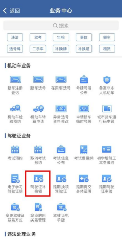注册登录“交管12123”APP → 更多业务 → 业务中心 → 驾驶证业务 → 驾驶证补换领。
