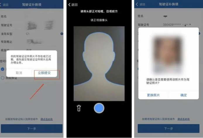 ③对于存在有效驾驶证照片的,确认是否继续办理或更换照片;对于不存在有效驾驶证照片或更换照片的,可按照系统提示引导,在线提交驾驶证证件照片。