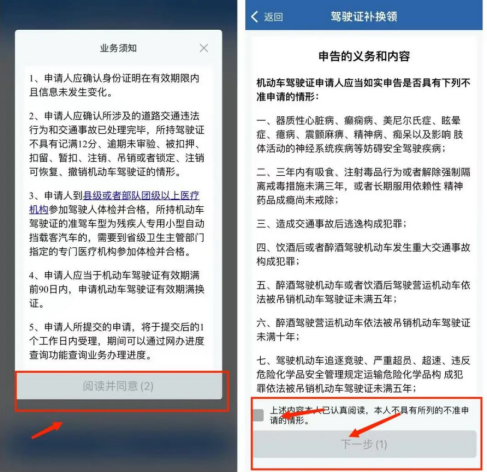 ④进入到业务须知页面,认真阅读后点击【阅读并同意】,进入申告的义务和内容页面,认真阅读并确认不具有所列的不准申请的情形,点击【下一步】。