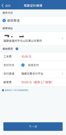 ⑤进入取件方式、支付方式选择页面。选择邮寄,填写收件地址及联系电话,确认需缴纳的费用以及缴纳方式,点击【下一步】。