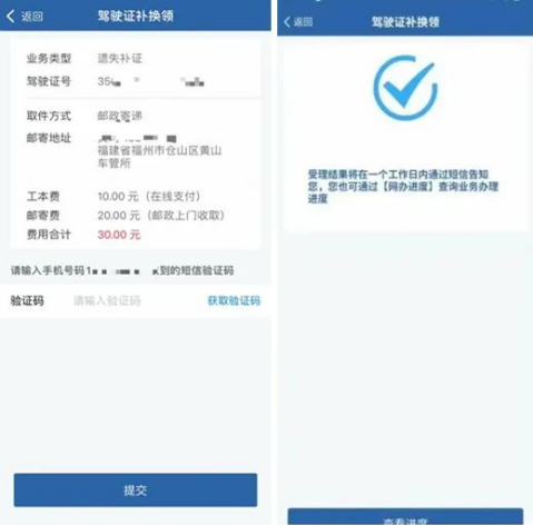 ⑦邮政工作人员会将新驾驶证快递到您填写的收件地址处,足不出户就可以收到您的驾驶证。同时,您也可以通过首页上的网办进度进行查询。