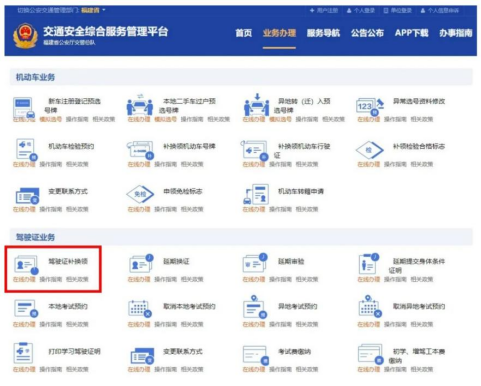 注册登录交通安全综合服务管理平台 → 业务办理 → 驾驶证业务 → 驾驶证补换领。
