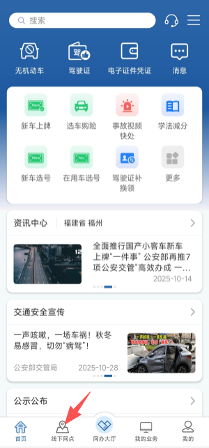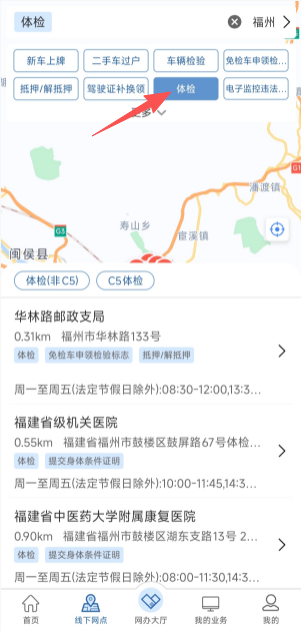 打开“交管12123”APP,点击首页下方“线下网点”(图一),点击“体检”(图二)即可查询附近支持驾驶证体检的医院。