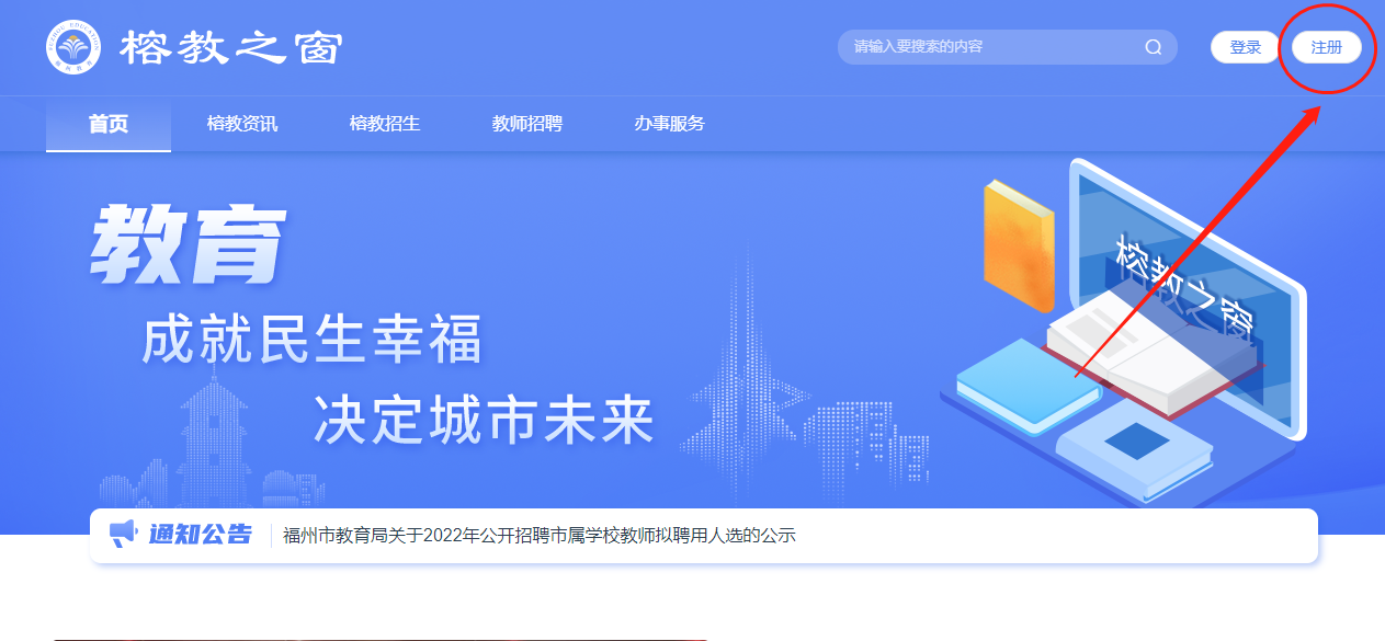 打开榕教之窗门户地址https://rjzc.fzedu.pub/home,点击首页右上角【注册】,在福建社会用户实名认证和授权平台,按照页面提示输入信息,获取验证码并阅读和接受用户协议后,点击【注册】,提示注册成功并返回首页,自动登录。