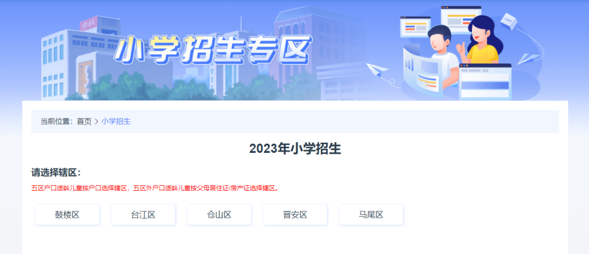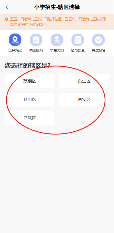 五区户口适龄儿童按户口选择辖区,五区外户口适龄儿童按父母居住证/房产证选择辖区。