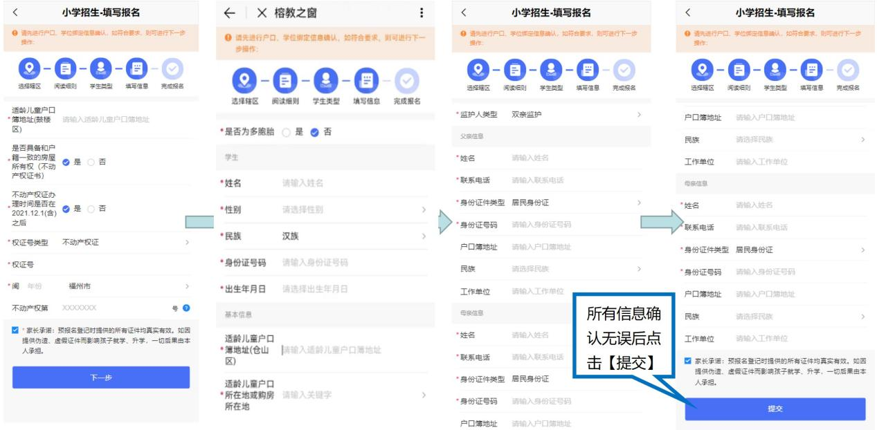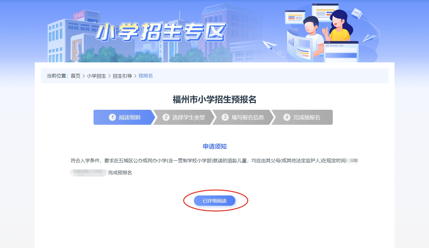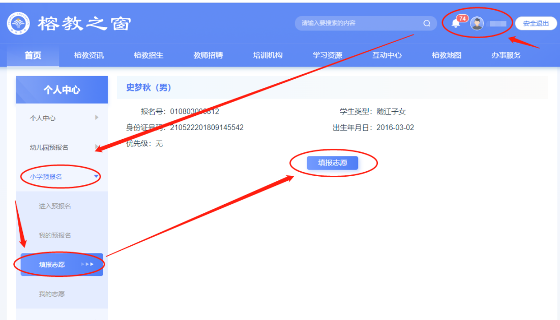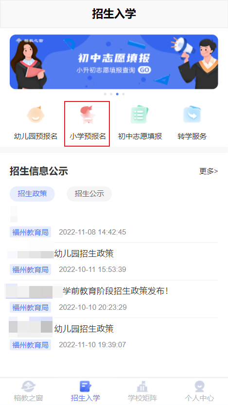 5、点击【招生入学-小学预报名】进入小学预报名页面