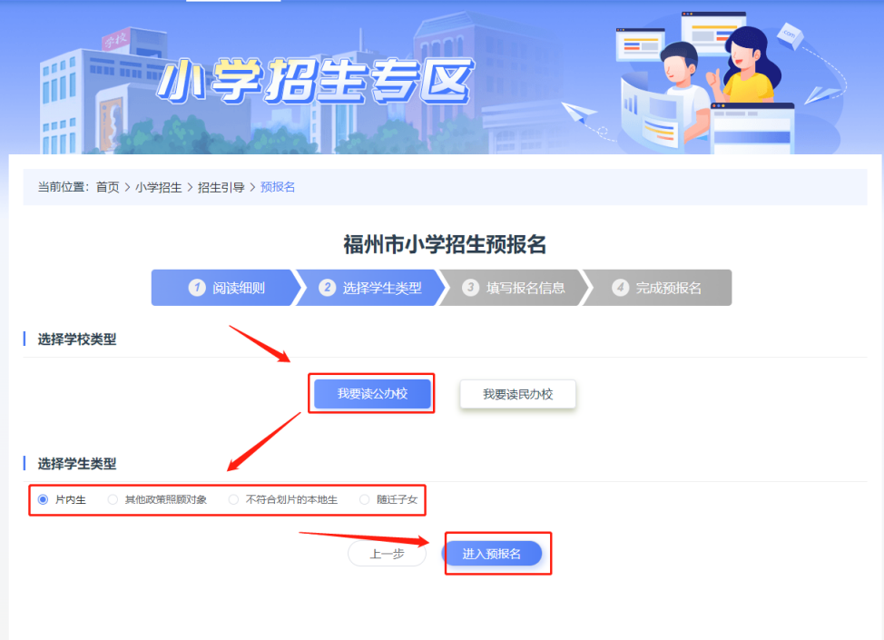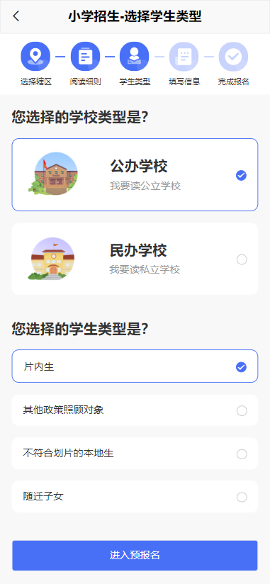 5.点击“我要读公办校”,选择学生类型,进入预报名