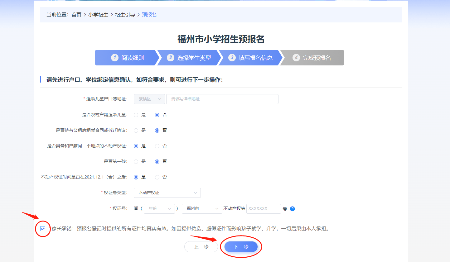 (2)如孤儿的户口在五区父母遗留或自有的房产所在地,并能提供房屋所有权证(不动产登记证),按片内生预报名,不需填写父母信息,填写其他监护人信息(户口簿地址按孤儿户口簿地址填写)。