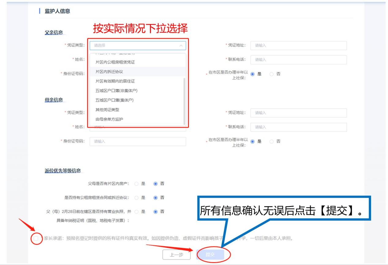 (3)单亲家庭随迁子女按实际下拉选择监护方的居住凭证类型,丧失监护权或监护能力一方居住凭证类型选择“由父亲单方监护,不具备相应凭证”或“由母亲单方监护,不具备相应凭证”。