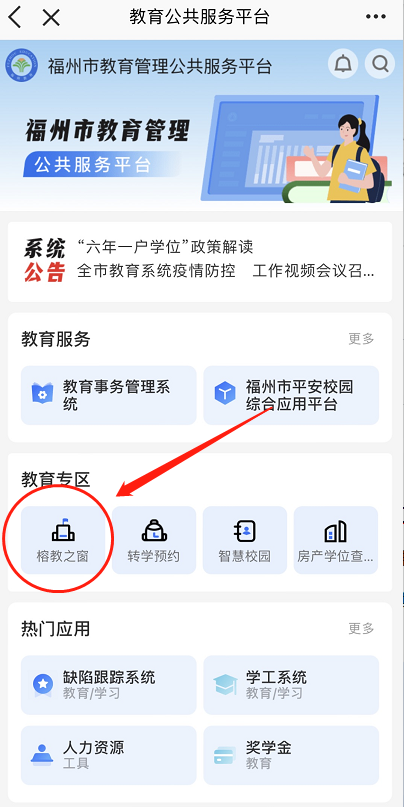 4、进入“教育公共服务平台”,在【教育专区】中找到【榕教之窗】,点击进入【榕教之窗移动端】页面。