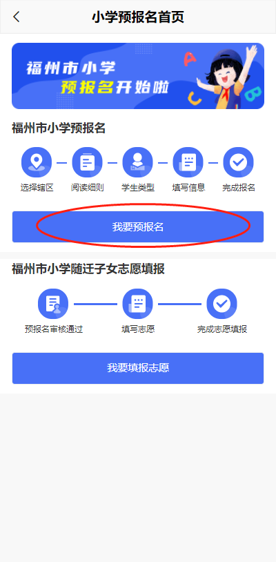 入学凭证核查通过的随迁子女通过榕教之窗系统【个人中心-小学预报名-填报志愿】进行网络填报志愿操作。