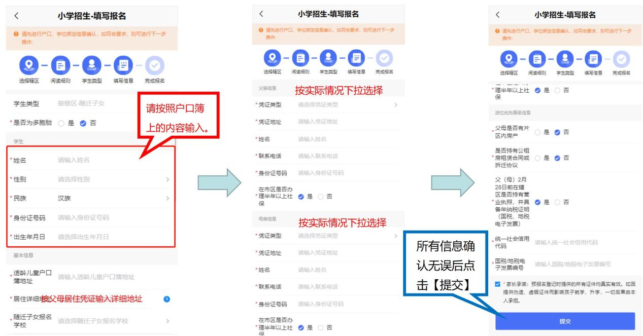 修改基本信息:报名期间被学校退回修改的,家长可修改填报学生信息重新提交;注:不可修改辖区和学生类型。