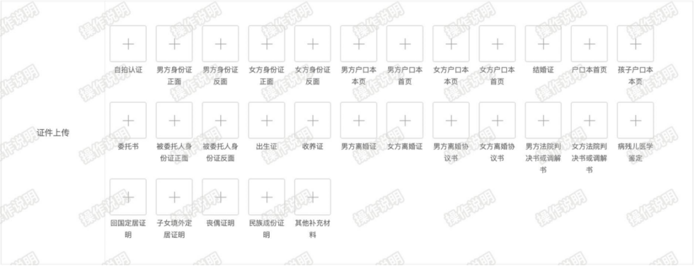 (1)证件上传:点击对应的照片从电脑中选择对应的图片进行上传,图片格式为jpg/png。 夫妻双方的身份证,结婚证(未婚可不上传),户口簿,自拍认证为必选项。