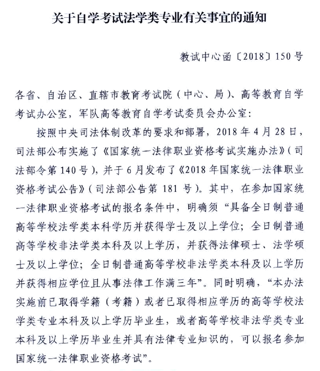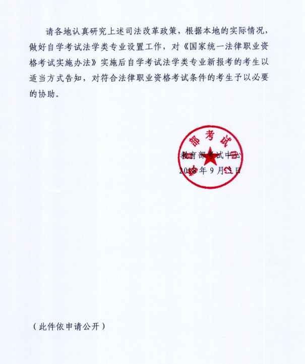 现将教育部考试中心《关于自学考试法学类专业有关事宜的通知》转发你们,请认真研究相关司法改革政策,及时告知报考自学考试法学类专业的考生。