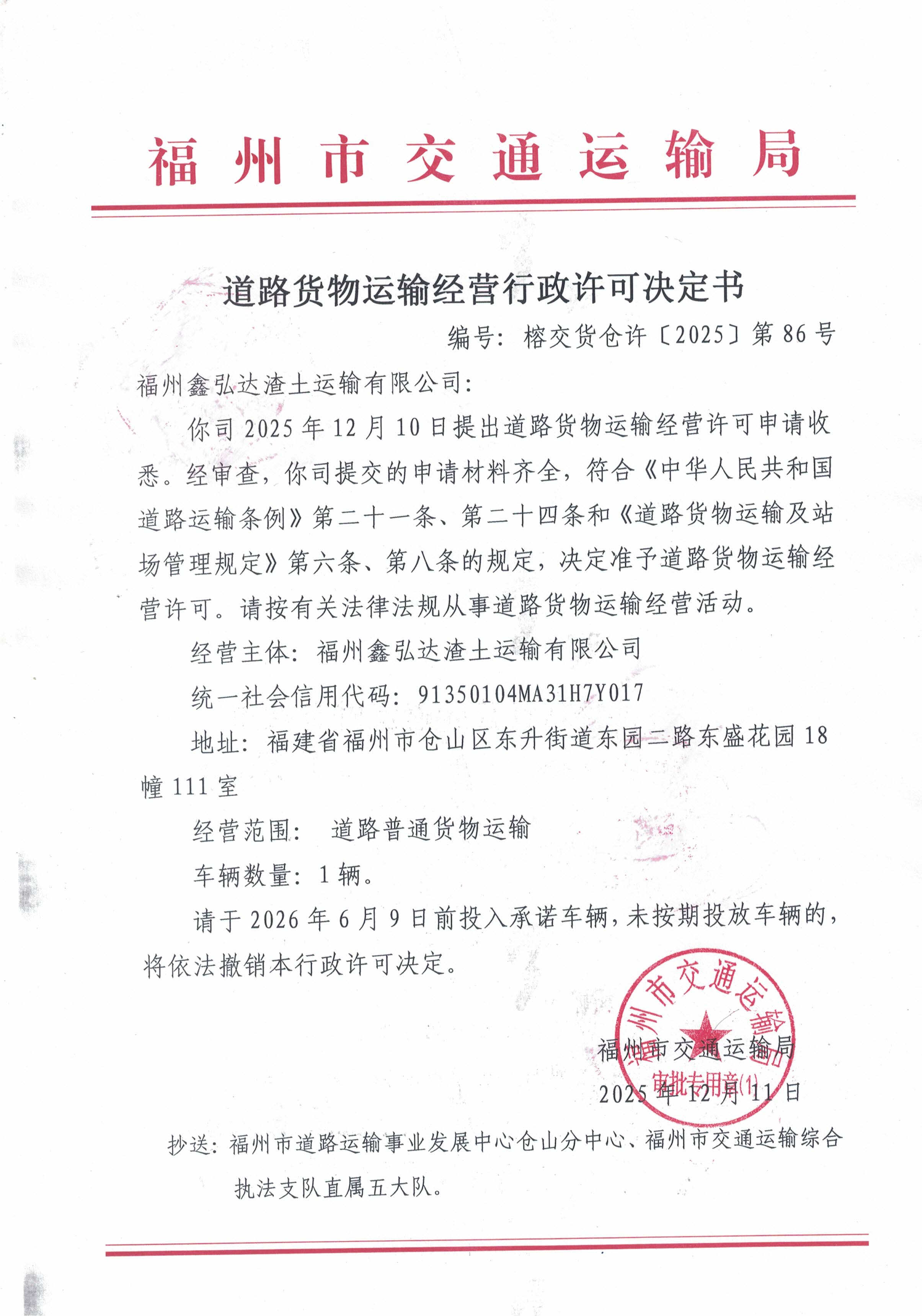 最佳线上百家乐娱乐场交通运输局关于道路货物运输经营行政许可决定书(榕交货仓许〔2025〕第86号)