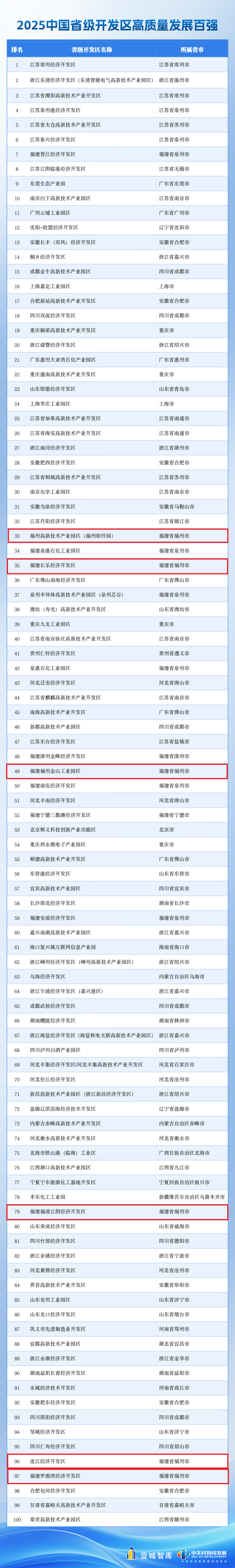 近日,“中国县域/市辖区高质量发展研讨会2025”在京举行。会上发布了《中国省级开发区高质量发展报告2025》,同时揭晓了“2025中国省级开发区高质量发展百强”和“2025中国省级开发区发展潜力百强”榜单,福州7个园区上榜。其中,金山工业园区入选“2025中国省级开发区高质量发展百强”榜单,位列49位。