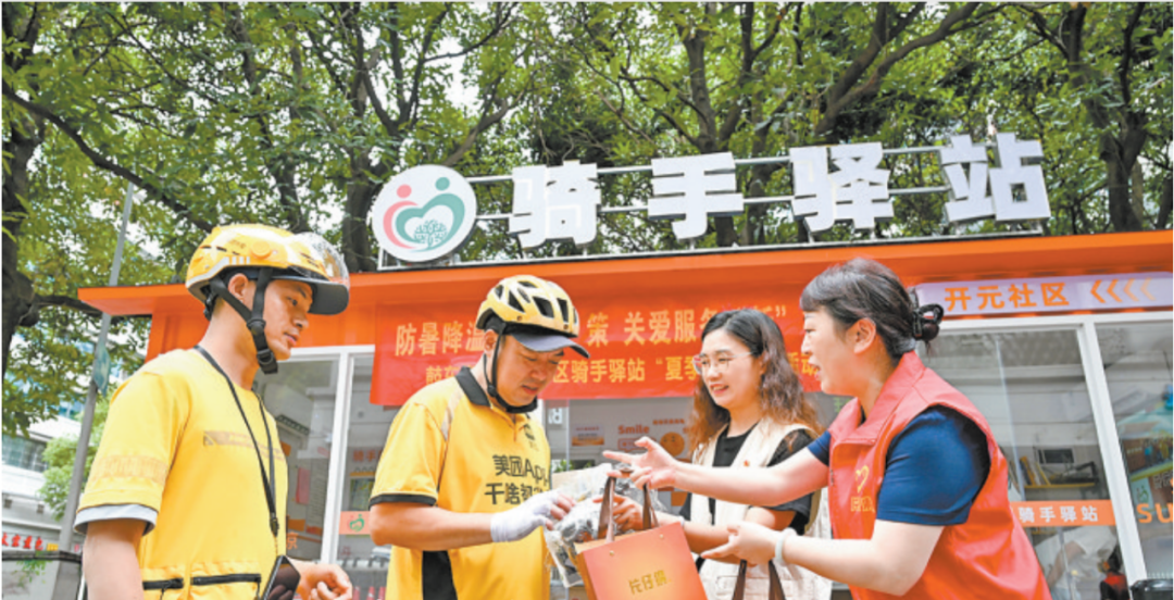 街道党工委充分发挥党建引领作用,精准捕捉骑手实际需求,驿站不仅提供24小时免费充电、休息区、图书角等基础服务,联合400家暖心商铺为骑手提供专属优惠,还依托民政、消防等部门对骑手们进行专业培训,组建2支骑手应急救援队,推动骑手变身“移动急救员”和“风险预警员”。同时,街道牵头成立“萤火虫骑士志愿服务队”、建立“骑手议事会”,充分发挥骑手走街串巷、灵活机动的优势,引导他们担任社情民意“信息员”、城市形象“宣传员”、风险隐患“警报员”,用“骑手力量”为社区和谐添砖加瓦,实现“服务—治理”双向循环。