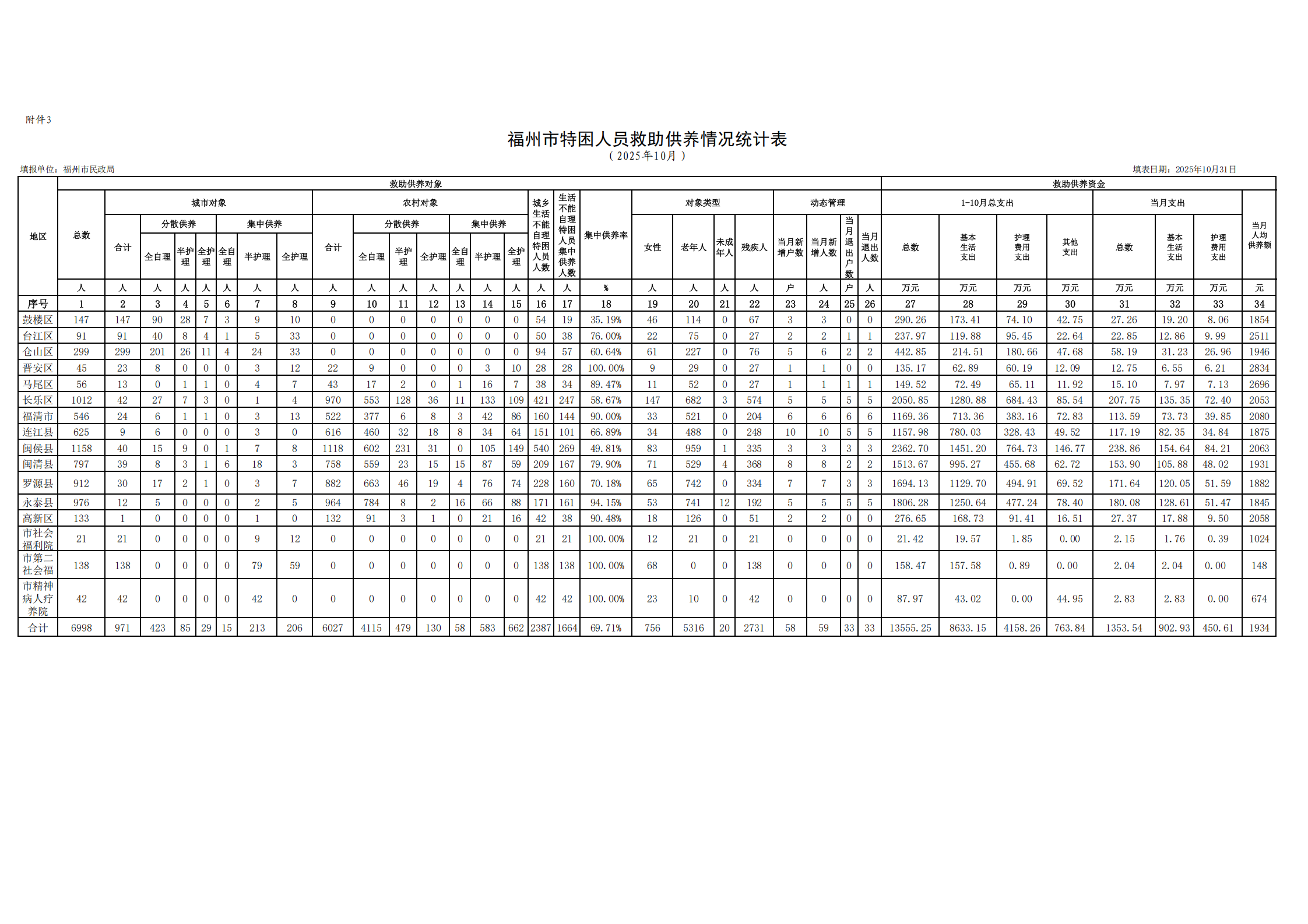 2025-10福州特困人员救助供养情况统计表
