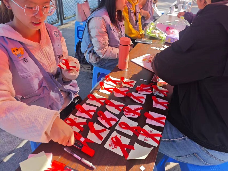 活动现场,由至诚学院学生组成的志愿者团队成为防艾宣传的“主力军”:他们将“社会共治 守正创新 终结艾滋”主题融入海报创意设计;通过扫码问答的形式,将艾滋病传播途径、预防措施等知识点转化为轻松考题;现场设置的“红丝带寄语卡片”前人头攒动,同学们纷纷写下自己的美好祝愿,贴上象征关爱与支持的红丝带,用青春态度传递反歧视理念。此外,红十字志愿者还为学生发放图文并茂的宣传手册和防艾用品,解答关于艾滋病检测、治疗政策等疑问。