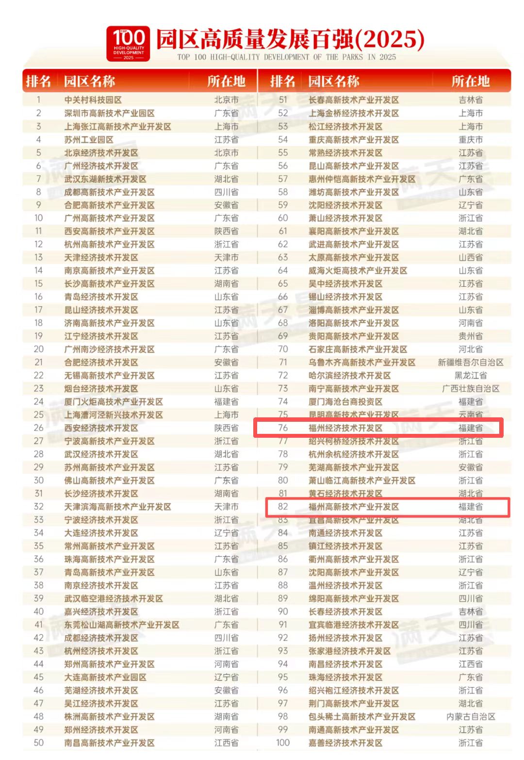 近日,赛迪顾问发布《2025年中国园区经济高质量发展研究》和“园区高质量发展百强(2025)”榜单。我市福州经济技术开发区和福州高新技术产业开发区双双荣耀登榜,上榜数量位居全省首位!
