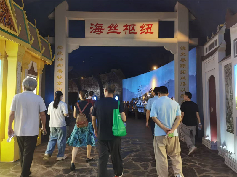 随后,大家步入马限山时空隧道。这是利用马限山人防隧道打造的文化展示空间和便捷通道,连接着中国船政文化城核心区和马限山周边各景点和遗址。隧道内,浮雕、壁画、船模、星空航线图等,通过现代声光电技术,生动地还原了从福州新石器时代的昙石山到历史悠久的船政文化。船政文化展区的“闽人善舟”“海丝枢纽”“千年局变”三大篇章,让人仿佛穿越时空,见证了船政文化的发展历程;人防科普主题展区的四个篇章,让大家再次重温了人防的发展历程,增强国防观念和使命担当。