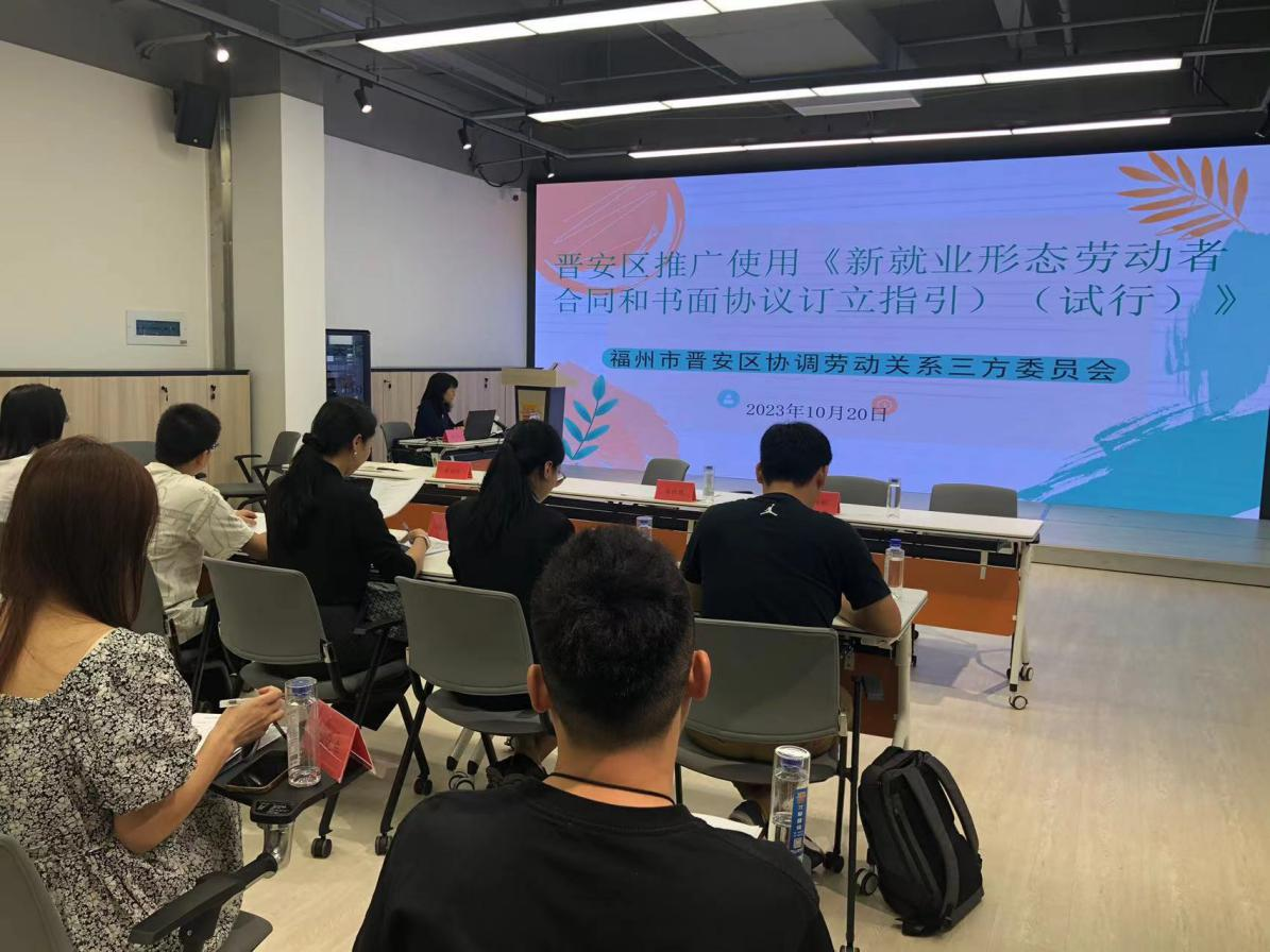 会上,晋安区人社局对中央、省、市关于维护新就业形态劳动者劳动保障权益工作政策进行详细解读,帮助平台企业准确理解相关政策。晋安区人社局劳动关系法规科负责人积极引导平台企业推广使用人力资源和社会保障部办公厅《新就业形态劳动者合同和书面协议订立指引(试行)》,并对新就业形态劳动者合同和书面协议订立做相关指引说明,以帮助平台企业准确理解《指引》内容,指导平台企业规范新就业形态用工方式,稳妥有序推动《指引》应用,从源头上预防和减少劳动争议发生,切实维护新就业形态劳动者劳动保障权益,促进新业态规范健康发展。晋安区总工会指导平台企业建立工会工作和集体协商工作,并介绍工会关心关爱新就业形态劳动者的相关保障工作。