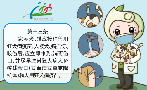 国家最新发布的《健康素养66条》第13条指出:家养犬、猫应接种兽用狂犬病疫苗;人被犬、猫抓伤、咬伤后,应立即冲洗、消毒伤口,并尽早注射狂犬病人免疫球蛋白(或血清或单克隆抗体)和人用狂犬病疫苗。