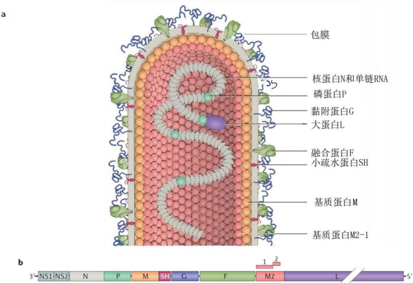 RSV为肺病毒科,它的病毒颗粒呈球型或丝状,外面有一层包膜。包膜上嵌有两个重要糖蛋白——融合蛋白F和黏附蛋白G,它们帮助病毒感染人体呼吸道。
