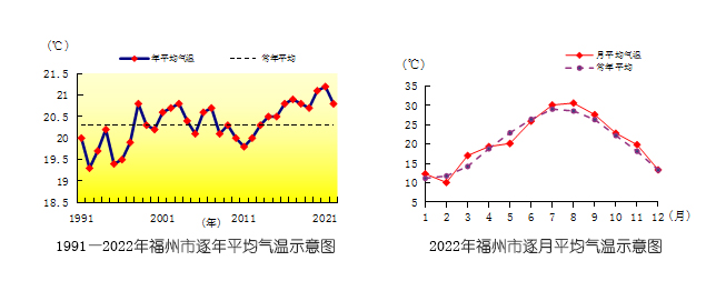 各县(市)区年平均气温20.1℃~21.3℃,距平0.1℃~0.8℃,其中闽清、罗源和福清正常,连江、长乐偏高,其余县(市)区属显著偏高。各县(市)区年最低气温0.9℃~3.2℃,永泰出现在2月25日,其余县(市)区出现在2月21日。各县(市)区年最高气温36.8℃~42℃,市区出现在7月24日,永泰、罗源和长乐出现在7月23日,福清出现在8月6日,闽清和闽侯出现在8月22日,连江出现在8月25日。