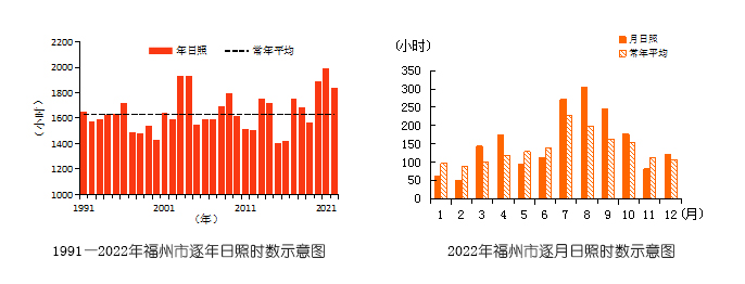 各县(市)区年日照时数1671.4~2178.7小时,异常度0.3~2.6;其中闽清异常偏多,闽侯和福清显著偏多,连江偏多,其余县(市)区均属正常。