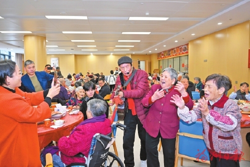 “今年的菜非常好。”85岁的高鹤鸣怀抱吉他,在摆满佳肴的圆桌间穿行,弹唱起欢快的《新年好》。一曲唱罢,老人们纷纷鼓掌,脸上洋溢着幸福的笑容。