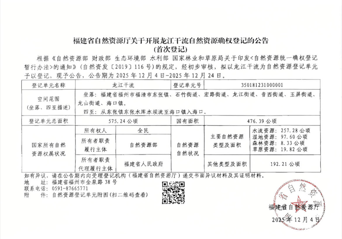福建省自然资源厅关于开展龙江干流自然资源确权登记的公告(首次登记)
