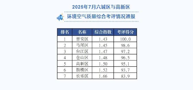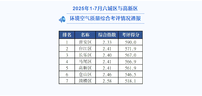 为贯彻落实党中央关于“打好污染防治攻坚战”“蓝天保卫战”精神,根据《提升最佳线上百家乐娱乐场环境空气质量行动计划》和《最佳线上百家乐娱乐场空气质量综合指数考评办法》,现将2025年7月及1-7月各县(市)区环境空气质量综合考评情况通报如下: