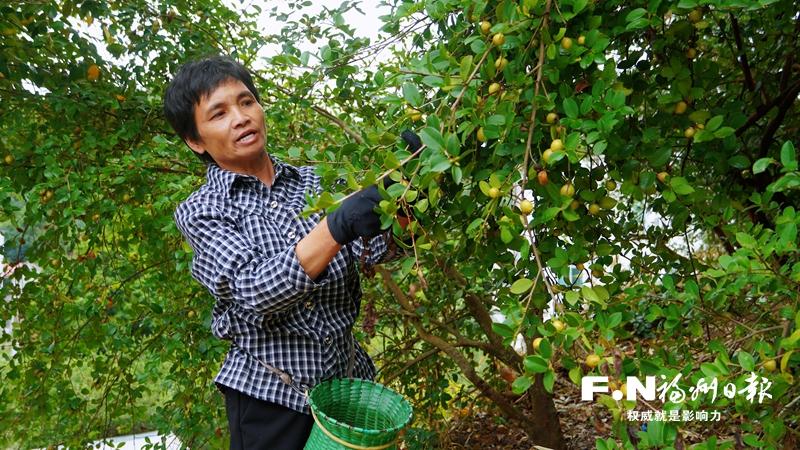 溪源村村民张杰平在采摘油茶果。(闽清融媒体中心供图)